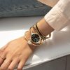 - Round watch featuring black glossy dial with gold-tone hands and stick markers