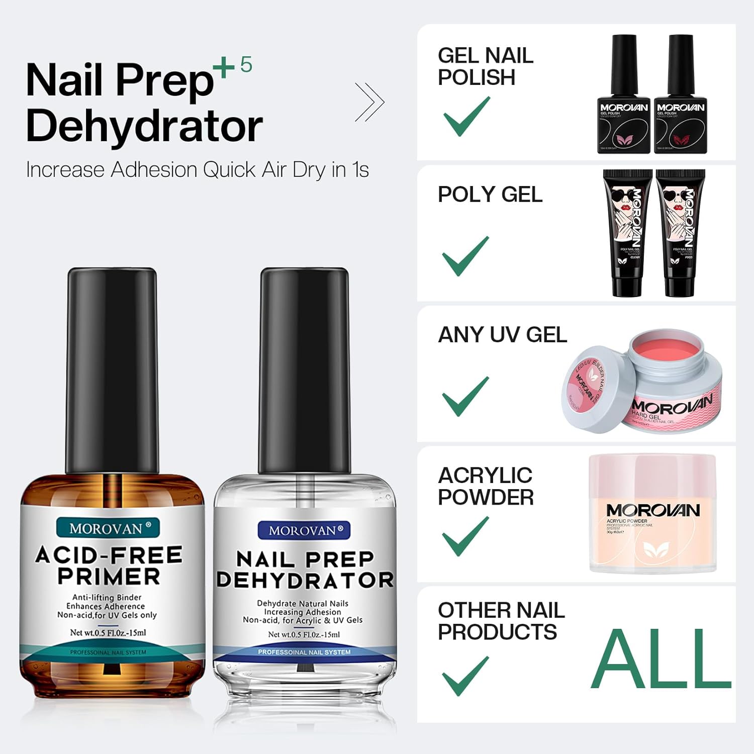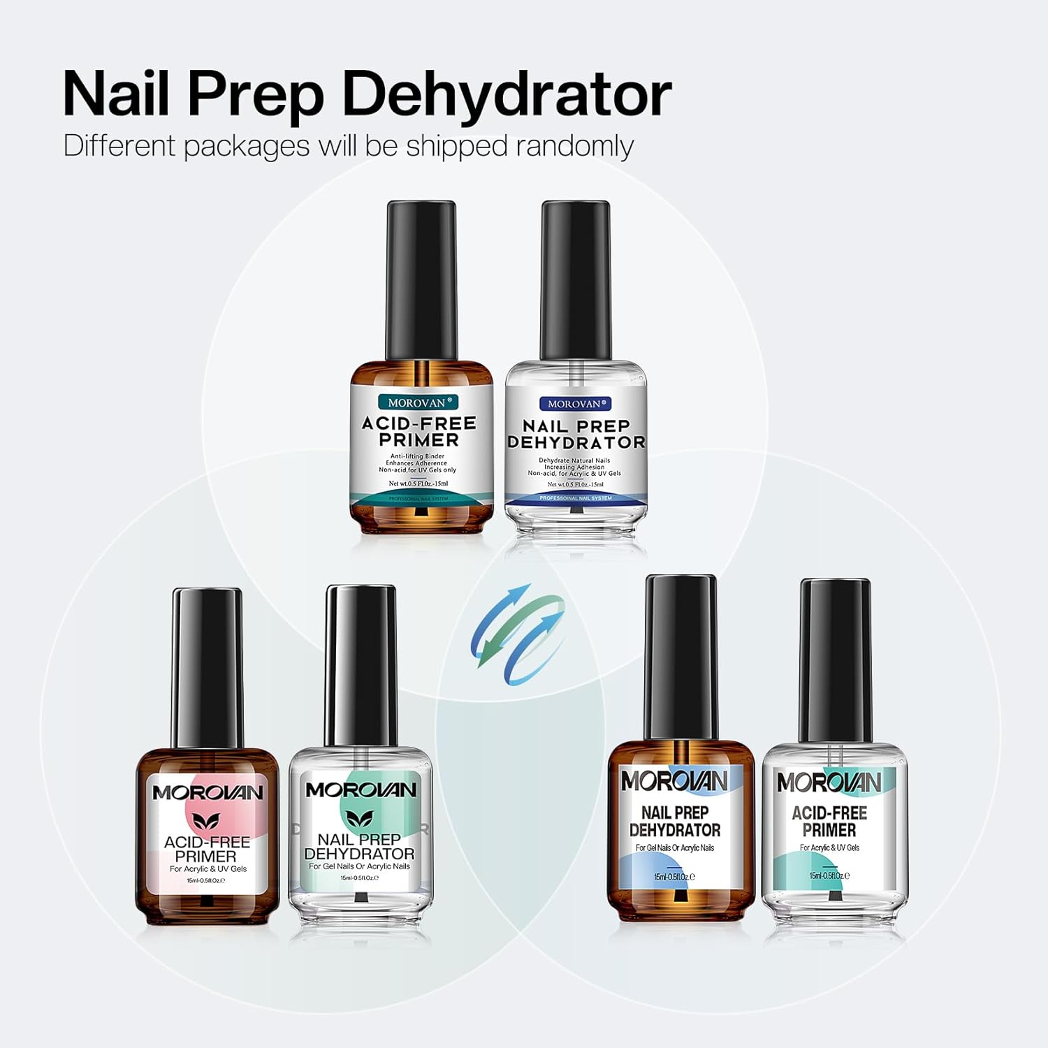 - BALANCE & PREVENT: MOROVAN Nail Primer Dehydrate Bond is perfect to reduce nail oil & to create a strong foundation! And Nail Bond Acid-free Primer is to create a perfect nail base for gel application.